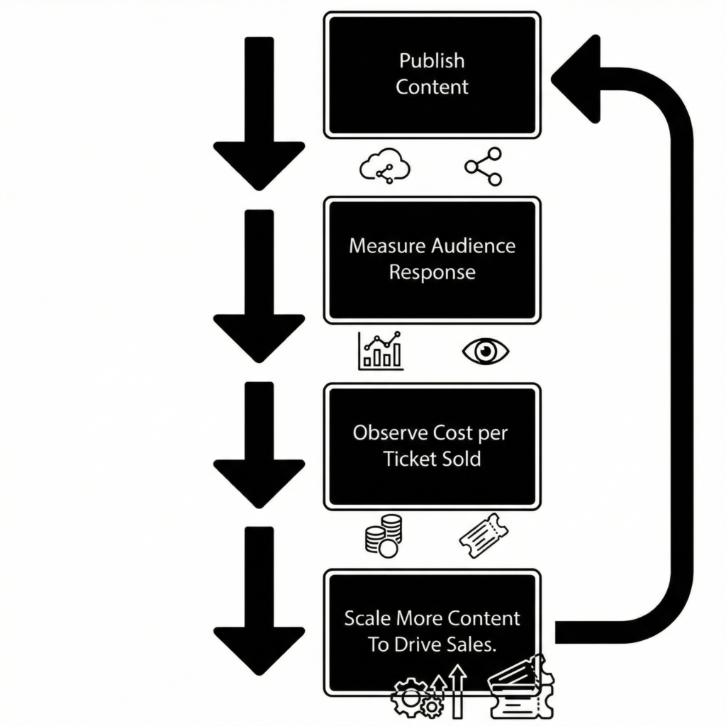 That response is not evaluated on engagement alone, but on its downstream effect: how efficiently tickets are sold. As content output increases, we observe changes in cost per ticket sold and adjust promotion accordingly.